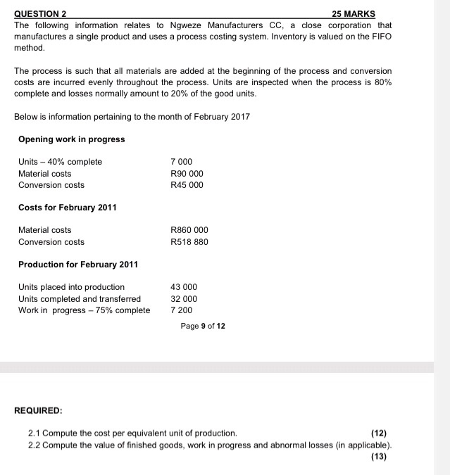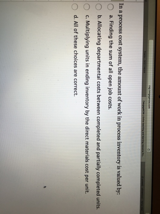 Allocating departmental costs between completed and partially completed units Od. ACC 1B CHAPTER 3 TEST In a process cost system the amount of work in process inventory at the end of a period is valued by bsumming the costs remaining in each department account at the end of the period. Allocating departmental costs between completed and partially completed units. In a process cost system the amount of work in process inventory is valued by. Allocating departmental costs between completed and partially completed units Od. Process costing is an accounting method typically used by companies that mass produce very similar or identical products or units of output. In a process cost system the amount of work in process inventory is valued by Oa. The company charges any under- or overapplied overhead to Cost of Goods Sold. Multiplying units in ending inventory by the direct materials cost per unit d.