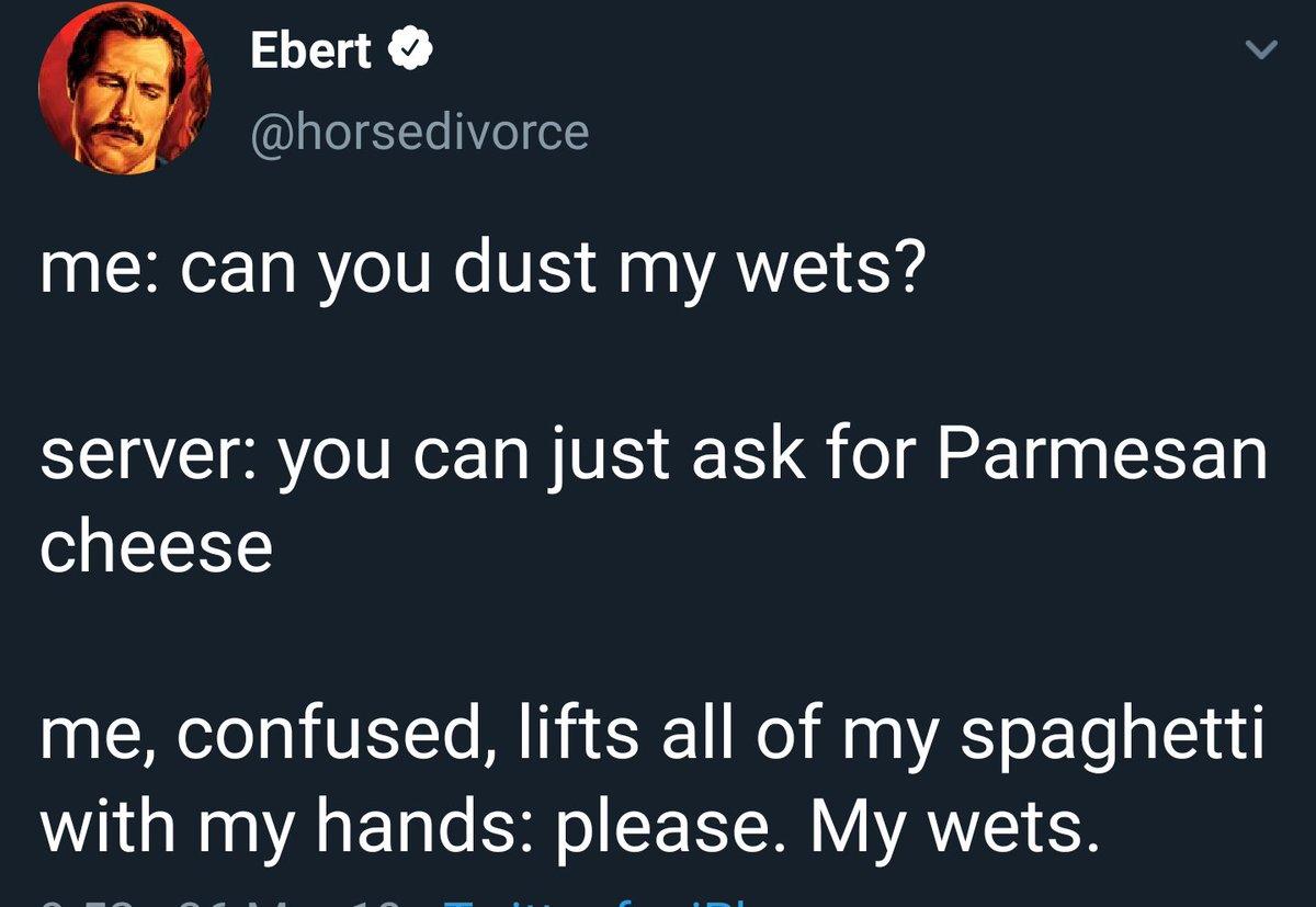 Im furious that I cant get it out of my head. List of every PC game checked by System Requirements Lab. The setup of the joke is that the phrase dust my wets is absurd on its own but the second line establishing that its a question at a restaurant to a server gives it context that its a person that doesnt know the words for things. Can you dust my wets. My wets memes can memes dust memes just memes ask memes parmesan memes cheese memes confused memes lifts memes spaghetti memes please memes wets memes Video GIFs. Ebert horsedivorce March 6 2019. Can you dust my wets.